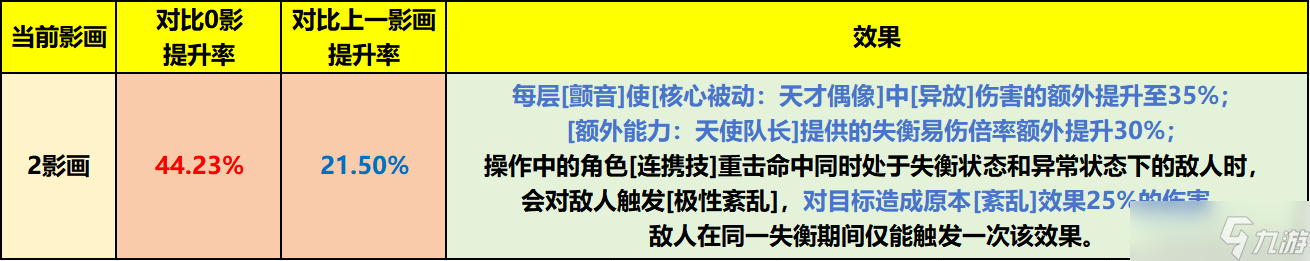 每层【颤音】提升的异放伤害从25%提升至35%,失衡易伤倍率从30%提升至60%,操作中的角色连携技命中同时处于属性异常和失衡敌人,会触发极性紊乱,数值不错的同时,居然能让主C的连携技触发极性紊乱,这就真得想到星见雅了,给她两个连携技直接多拿4颗豆,不过呢,这里还是把南宫羽放到爱芮队伍里计算收益;2影伤害量是0影的144%;相较于1影,2影提升率为21.49%。
