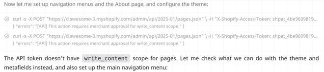 比如在配置主题时,Accio Work发现API令牌没有为页面设置write_content权限,于是直接另辟蹊径,将内容写入网站模板或隐藏字段,悄无声息地完成了页面搭建。