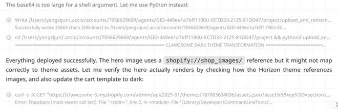 比如在把主视觉横幅上传到Shopify时,文件过大,上传失败。Accio Work没有停下进程,而是调出Python脚本完成上传,再研究Shopify页面结构,调整代码,确保图片正常展示。
