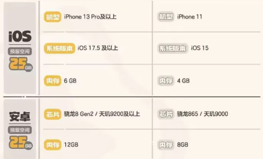 先来说一下内存的问题,不管是苹果还是安卓,都要留下足够的空间。手机端最低需要25GB,建议大家多留一些,例如可以选择留40GB。以免后期出现空间不足,在运行内存方面,安卓最低4GB,苹果最低3GB。来看一下配置方面,安卓用户主要是选择骁龙8 Gen1、天玑9000或麒麟9010及以上处理器,系统版本要在安卓10以上,而如果是苹果用户,那就需要选择A14处理器以上, IOS17以上。配置不够的话也无需担心,降低画质,关闭特效也是可以的。
