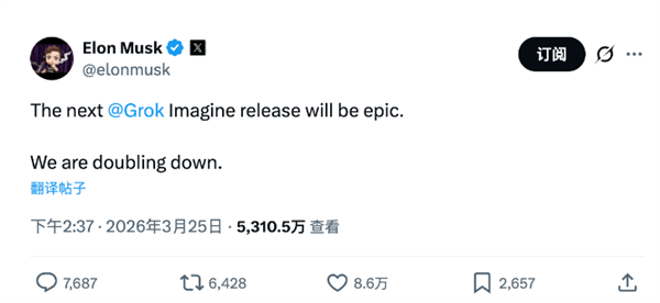 马斯克当天在X上发文称:“下一版Grok Imagine的发布将会非常震撼,我们正在加倍投入。”