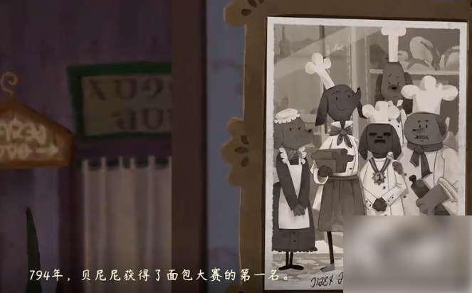 我们在接取到需求后,到后厨询问下厨师,会得知两个厨师都不会制作,所以只能去找在湖边钓鱼的店长,在出门前大家可以看一下墙壁的照片,记住是在794年贝尼尼获得了面包大赛的第一名。