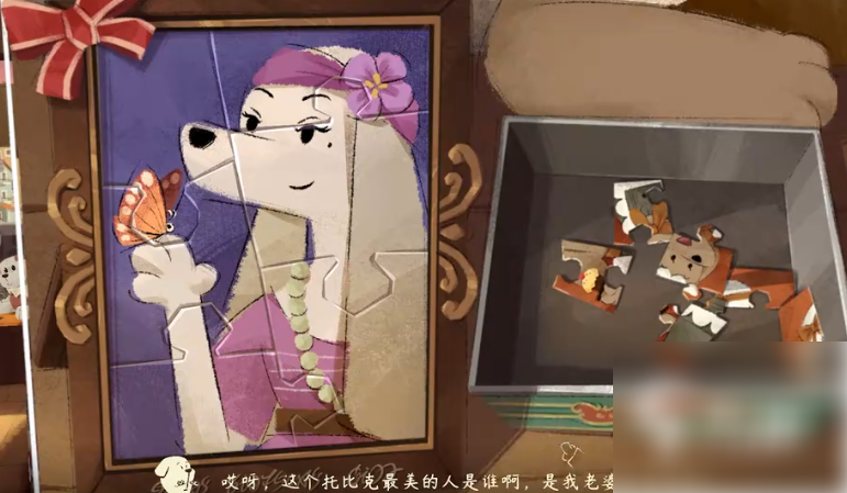 拼的时候需要注意,箱子里其实是两幅拼图,我们只拿紫色背景的出来就能快速拼好得到蜡烛,把蜡烛给老板娘,她会赠送我们一把小铲子,拿着铲子到老板身后的花坛使用,就能拿到蚯蚓。