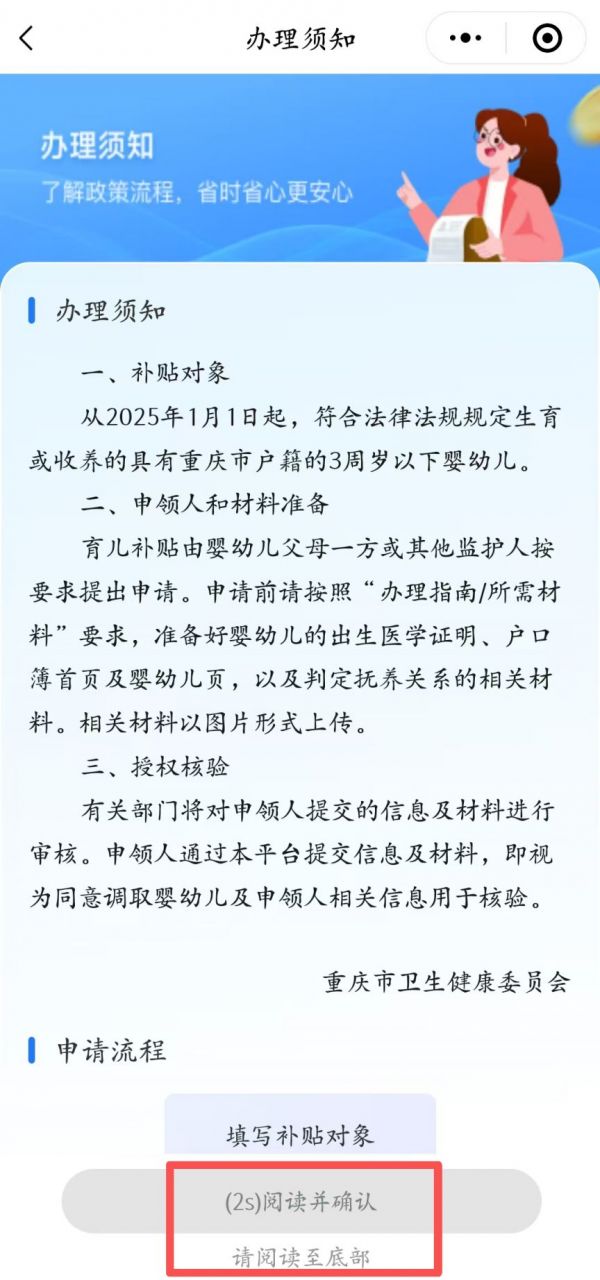 2.点击【我要申请补贴】,把页面拉至底部,点击【阅读并确认】。