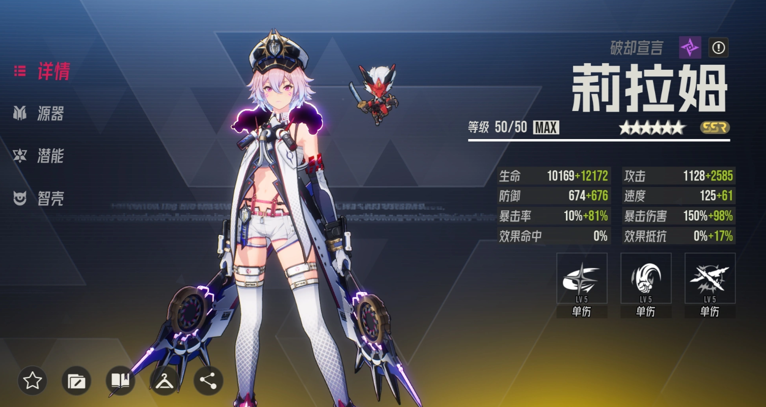 第二个为大家推荐的就是莉拉姆,莉拉姆这个角色可能很多玩家还没有用过,她当前作为一个破序角色的话,其实自身能力当中大部分都是输出效果,而且她的单体爆发输出能力也是非常高的,可以说是达到了顶尖那一批的强度,当然前期很多玩家没有提升之前,觉得他的强度可能跟同品质的角色是差不多的,但是如果将莉拉姆培养起来,在中后期去用的话,大家要是参与的炼狱副本类型关卡,她在这里对boss进行的战斗压制力是非常强的,而且在输出的整体阵容搭配当中也可以体现快速通关的优势,输出能力一般都是在线的,所以大家玩莉拉姆的话,还是有比较多的雷刃之类技能可以使用,这里伤害系数跟她的生命恢复能力也都是可以放在一起用的,比如伤害系数有260%的时候,后期还可以免疫击退,而她的行动进度也会得到提升。