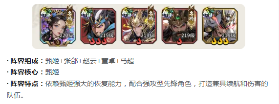 鼓舞强攻队这个阵容相对比较合适的,甄姬的恢复能力是队伍的底气。赵云,马超等人就可以组合成强攻先锋,可以把董卓放在前排,甄姬起到补血的作用,整个队伍在持续作战的过程中,就可以一直保持满状态。在打消耗战的时候一点都不需要害怕,确实越打越有优势。