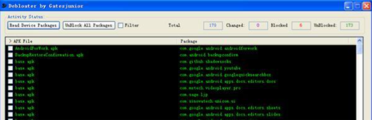 3、点击软件左上角的 Read Device packages 按钮,Debloater 会读取手机内全部 APP 程序,列出安卓系统所有 App 的包名和对应的 apk 文件;软件右上角会显示 App 总数、已冻结 App 数量,若此前用该软件禁用过 App,还会显示状态变更的 App 数量,方便用户还原初始状态。