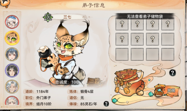 之后我们就可以正常查看弟子的储物袋啦!(也是替大家看了下三七身上都带了些什么。)