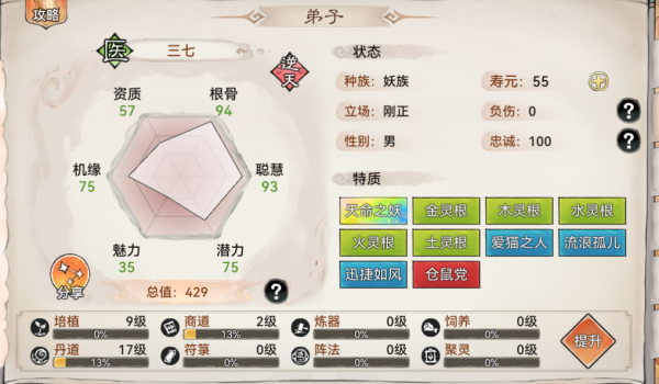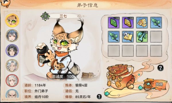 这时我们先点击想要的物品,再选择“索取”,就能以降低弟子的忠诚度为代价来获得它。(忠诚度掉一点无关紧要,会慢慢回复上来,但是不要掉太低,不然弟子不干活啦!)