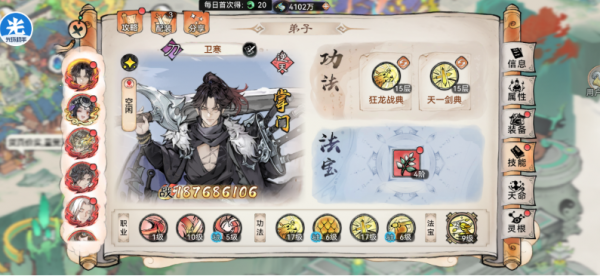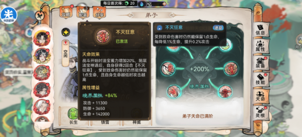 (3)功法搭配:狂龙+天一(刑天+天一),研习+20解锁充能,加速法宝释放速度。