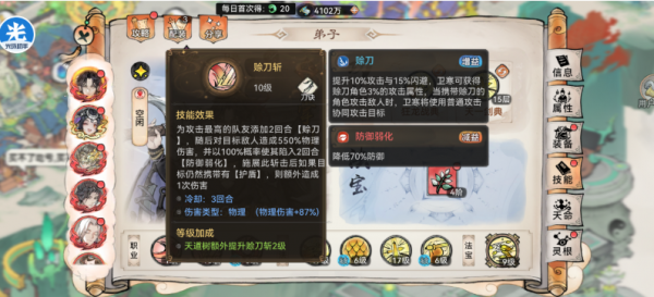 (1)协同增益:主动【赊刀斩】为队友加10%攻/闪避,自身累计5层普攻增伤+队友3%攻击加成,团队适配性拉满。同时有75%的概率令目标陷入【防御弱化】