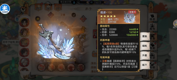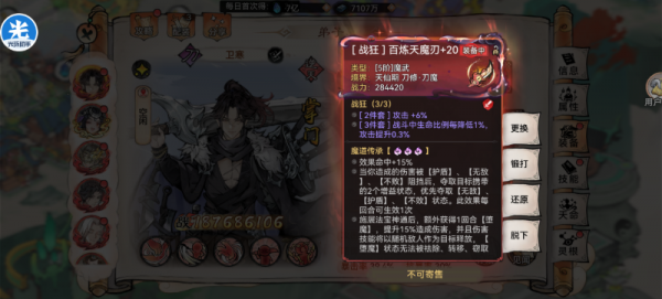 (2)装备套装选择:战狂套+魔刀,属于优先级攻击率>防御率>效果命中>生命率。卫寒的锁血核心机制,可以让他在极限空血时获得36%的攻击力提升,适配丝血输出场景。