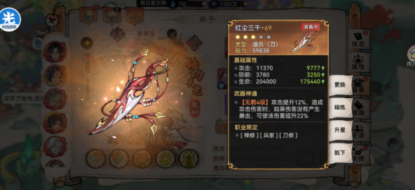 (2)刀修职业红天命技能:【不灭狂意】(法宝技能后2回合强化生存,血越低攻越高),受到致命伤害时仍然能保留1点生命,免死一次,坦度碾压常规输出弟子。