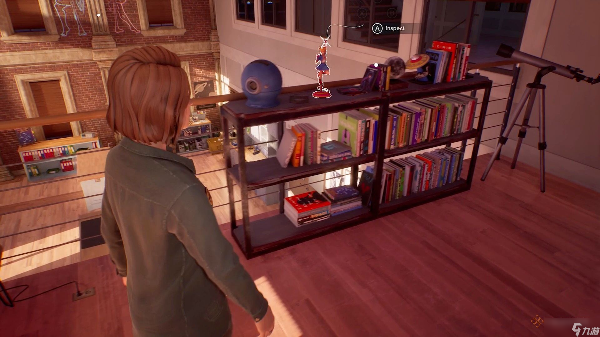 然而,手办在楼上。它在水壶右边那个较小的金属书柜顶上。这个手办看起来像个女学生。