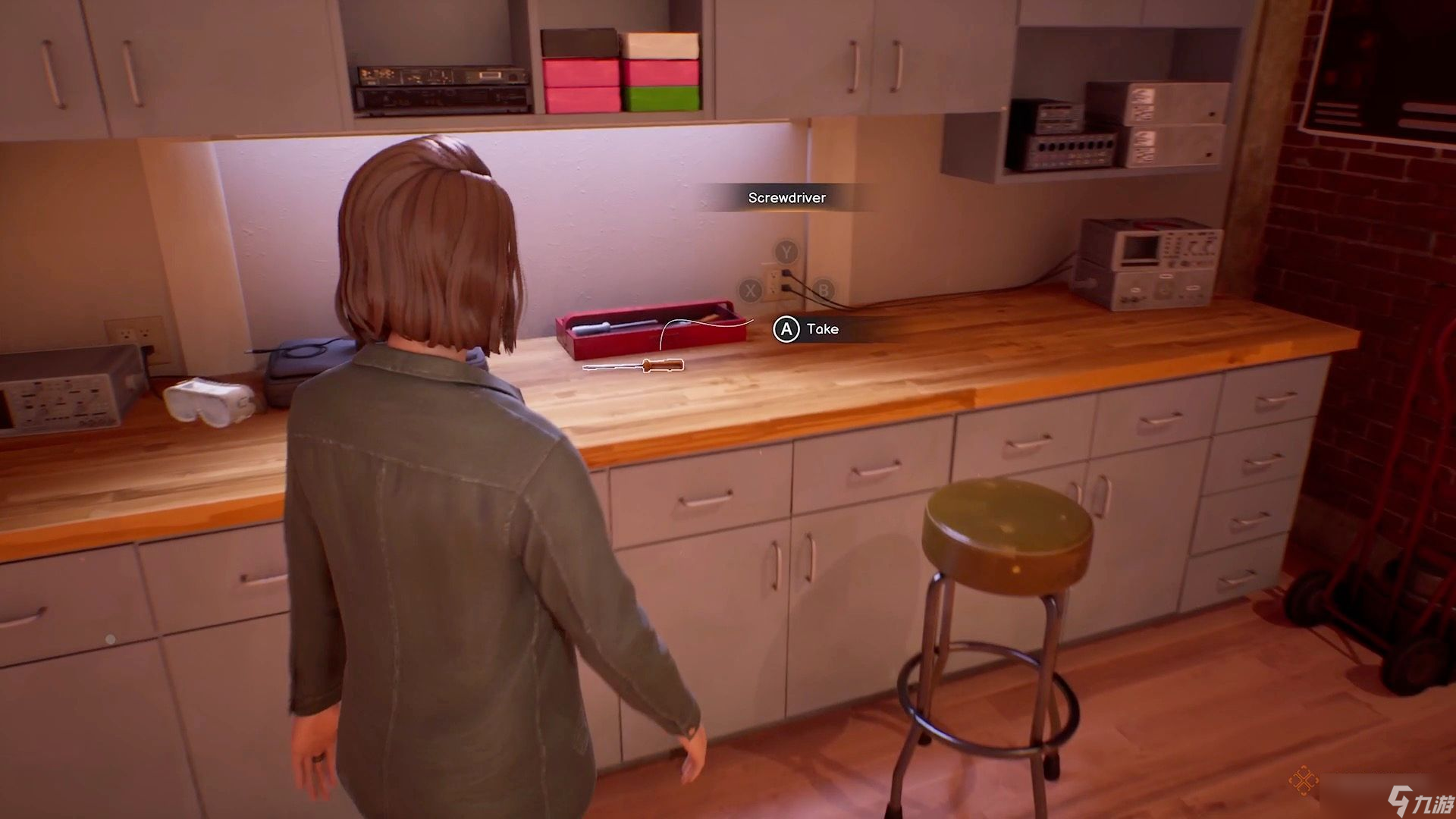 首先,拿起柜子上方偏右的螺丝刀。