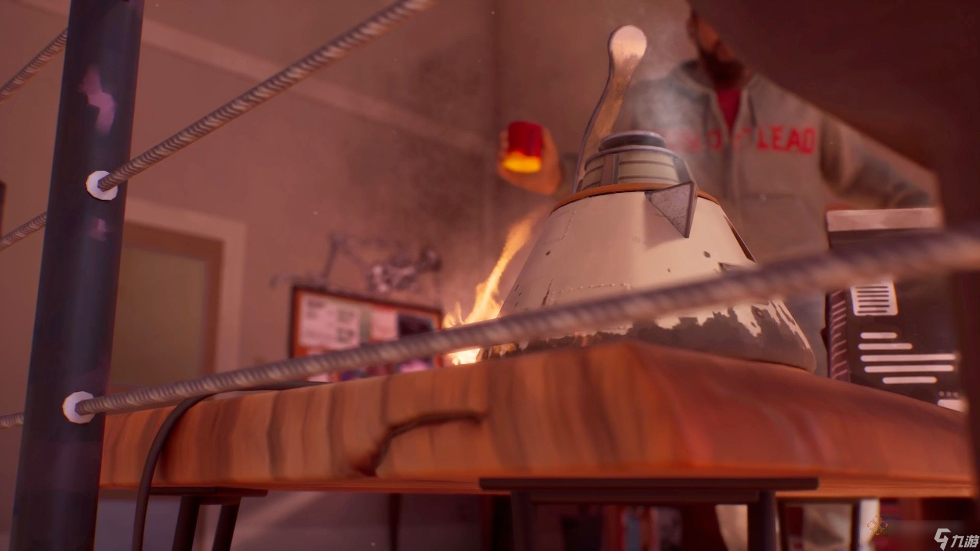 然而,在他行动之前,他那糟糕的水壶开始引燃旁边的桌子。为了救他,你需要立即倒带。之后,你必须阻止它再次发生,所以跑上楼去拔掉水壶的插头。