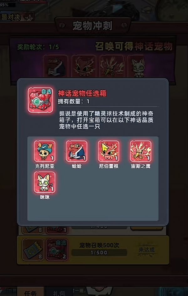 目前游戏里的宠物活动一共有三个,宠物冲刺,宠物转盘以及宠物探险。宠物冲刺是在生存的第14天开始的,一共分为5轮奖励,完成每轮冲刺任务之后就会获得对应的奖励宝箱,最终是神话宠物任选箱,达到这个奖励的任务条件是完成宠物召唤次数300或者是400以及500,唯一的区别就是500的话奖励宝箱是神话宠物5选2,其他两个只能选择1只。如果你已经达到500次的条件,那么大概率是宠物全图鉴了,所以大家如果是实在抽不出神话级宠物,就可以选择300档位的奖励,也是可以的。