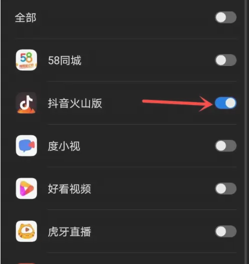找到“抖音火山版”,打开右侧的开关即可。