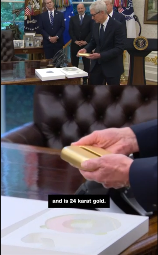 此前在2025年8月,苹果CEO库克还给特朗普赠送了一件特殊的礼物:一块由iPhone玻璃制造商美国康宁公司生产的“独特”玻璃,以及一个24K金的底座。