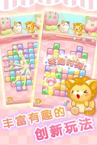 采用双主角叙事结构——萌猫与狮子爱共同踏上修复音乐树的冒险旅程。核心玩法聚焦于快速识别并匹配两个及以上同色方块完成消除,部分关卡嵌入原创背景音乐,并支持合成蝴蝶、闪电等特效道具,强化视觉反馈与操作爽感。