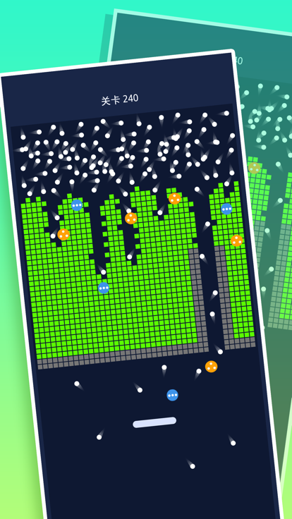 区别于传统三消机制,本作引入物理弹射逻辑:玩家发射球体撞击砖块实现消除,过程中球体可能随机分裂或再生,动态改变弹道轨迹与消除路径。每局目标明确——在最短时间内击碎指定数量砖块,强调反应速度与预判能力,重玩价值突出。