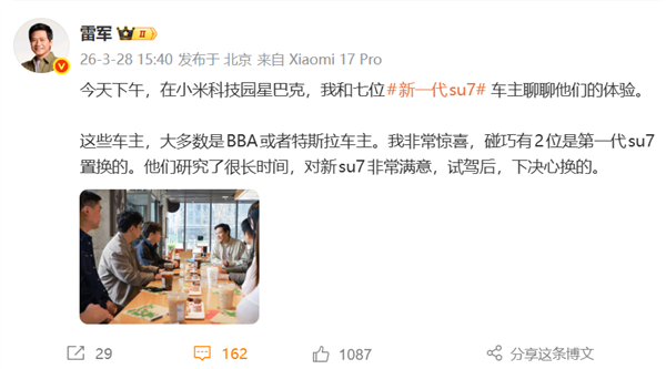 今日下午,雷军在社交平台分享动态,晒出交流日常:他现身小米科技园星巴克,与七位新一代小米 SU7 车主面对面座谈,深度倾听用户真实用车体验。