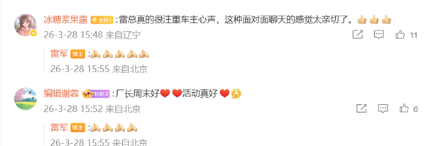 有网友点赞雷军接地气:直言他重视用户心声、线下座谈亲切暖心,也有网友羡慕车主能享受专属交流待遇,感慨雷总亲民又随和。