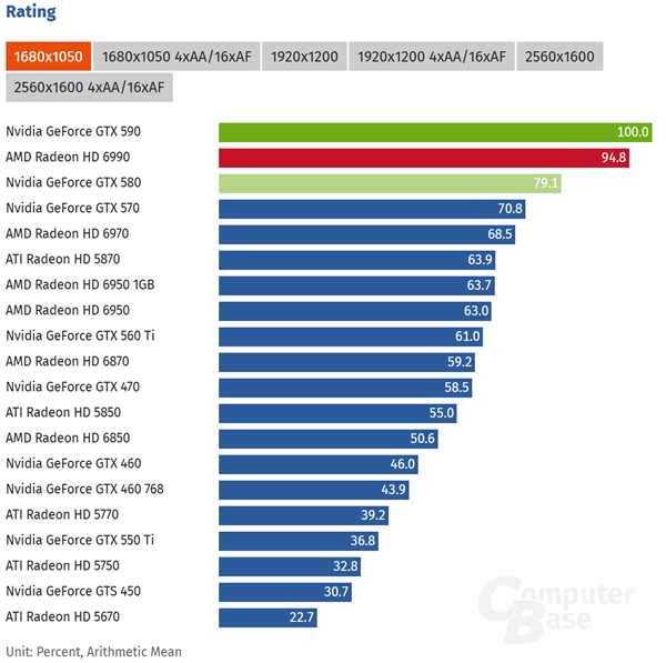 在性能表现上,ComputerBase的测试数据显示,在1680×1050分辨率下,GTX 590以100.0的综合指数领先HD 6990的94.8。