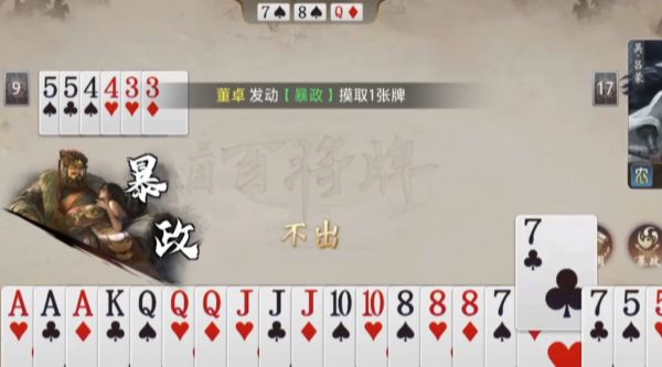 董卓的主要技能有两个,第一个被动技能【相国】,技能效果是在叫地主环节拥有优先叫分的权利,五人场的局该技能无法触发;第二个被动技能【暴政】,当你选择压牌时,可以选择弃置一只手牌,如果不压牌的话,那么就可以随机获得一张牌。根据董卓的技能效果我们可以选择弃牌流或者是囤牌流,大多数玩家会选择囤牌流,凑出炸弹,顺子等这种牌型,好让自己快速过牌。