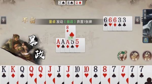 董卓的打法是需要看牌型的,牌型好,打的就快,我们可以利用暴政的第一个效果压牌弃牌快速出掉手里的牌。如果牌不好或者是三带比较多的话,那就可以利用暴政的第二个效果,先囤牌,囤几轮之后凑大牌型,拿下牌局的掌控权。在实战中,如果对手的水平参差不齐的话,大家可以优先选择叫地主,毕竟董卓有优势。但是在三人牌局中,囤牌有一定的局限性,特别是在抢到地主的情况下,如果选择囤牌流的话那就一定要掌握好牌型和时机,否则很容易翻车。