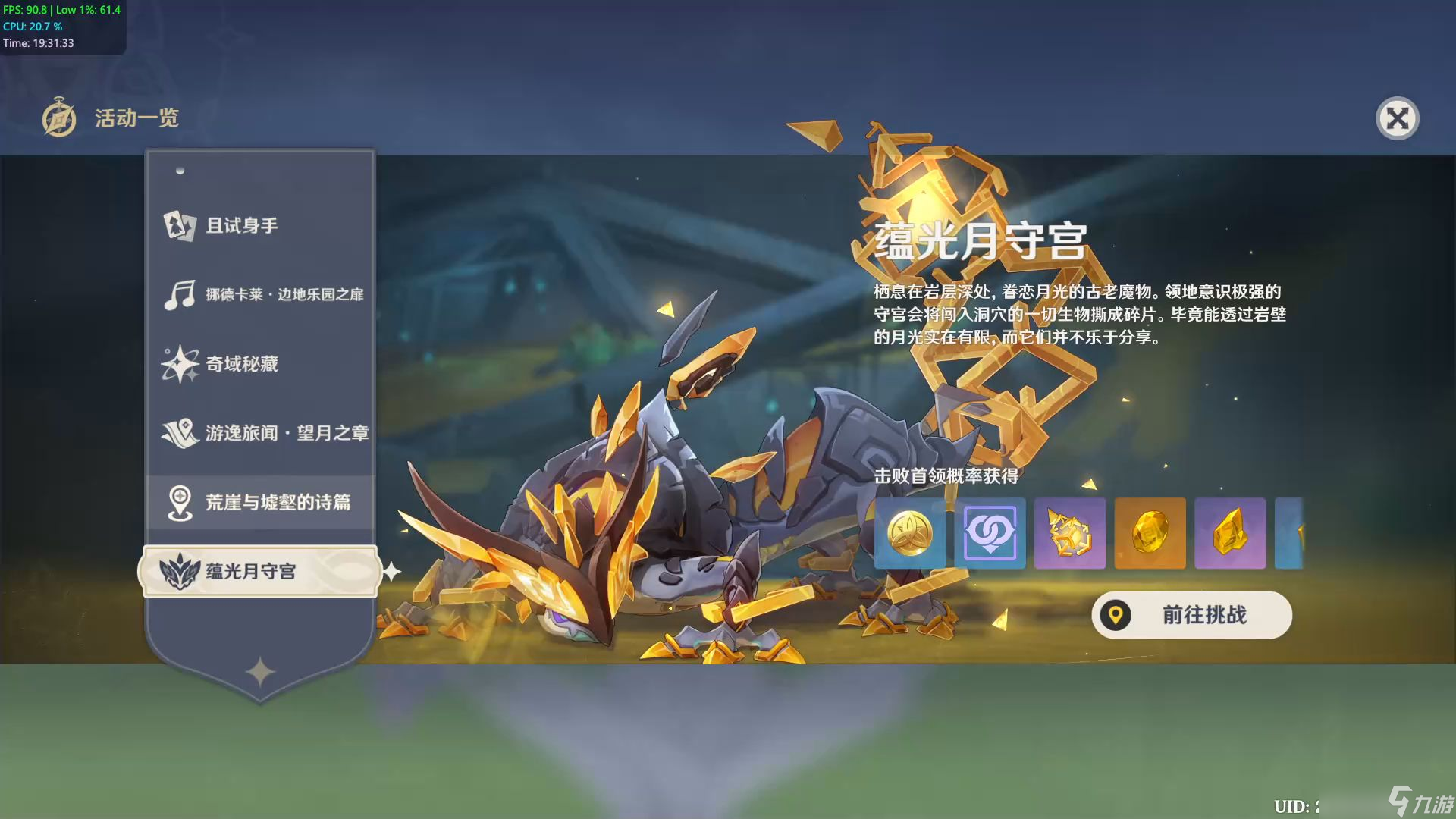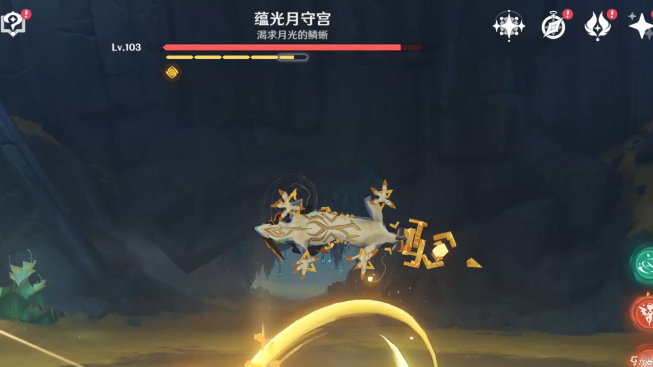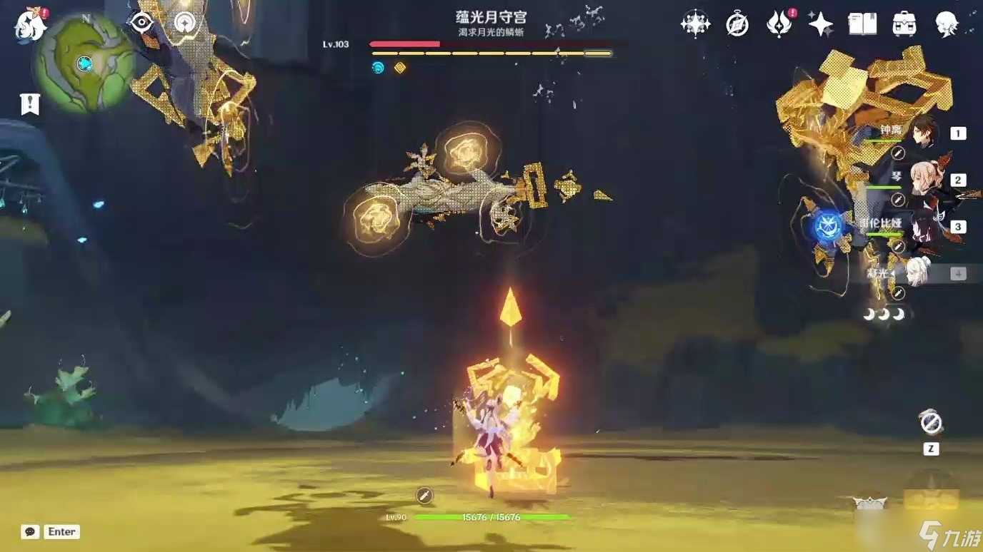 蕴光月守宫有蕴光debuff和多层岩盾两套联动机制,用岩系治疗队来打会比较轻松。入战4秒后BOSS就会触发周期性的蕴光机制,全队会受到穿盾扣血的影响。所有角色会被附加“蕴光之茧”,不仅治疗效果降低40%、输出伤害砍半,暴击率也会直接归零。同时BOSS自身岩抗额外提升60%,并且进入强化状态。应对这个机制最简单的方法就是带高奶量辅助,只要把角色血量抬满就能自动解除debuff。