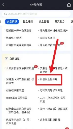 在业务中心页面右下角点击【科创板业务开通】进入