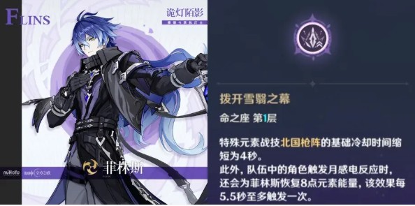 菲林斯的1命是让特殊E的冷却时间缩短为4秒,此外,队伍中的角色触发月感电反应时,还会为菲林斯恢复额外的能量。菲林斯的输出主要来源于小大招,1命让菲林斯在一波之内从2个小大招增加到了3个小大招,输出上相当于提升33%,算是很大的一个伤害提升。并且菲林斯比较缺乏的充能,也有了一定程度的缓解。