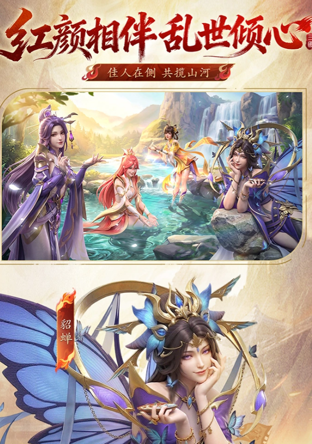 开发团队抛弃了市场里常用的扁平化美术风格,让全局动态建模使武将立绘活了起来,吕布战甲上的鎏金流光随着身体动作的变化而变化,大乔裙摆随着风的吹拂而舞动,像飞蛾扑火一样美丽,诸葛亮纶巾上隐约有花纹,又透着智慧者特有的气息。游戏将现代审美与东方古典形制融合起来,使得每一个技能的释放都具有震撼的视觉效果。
