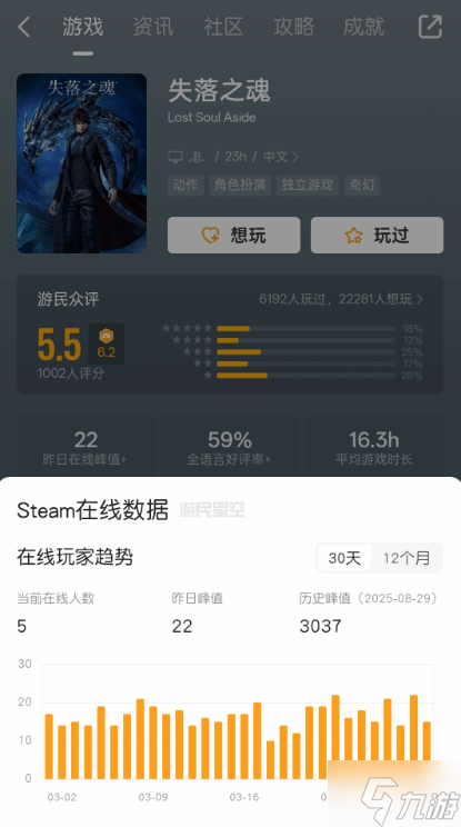 众评显示,近期《失落之魂》Steam每日平均在线人数仅维持在20人左右,社区活跃度极低。