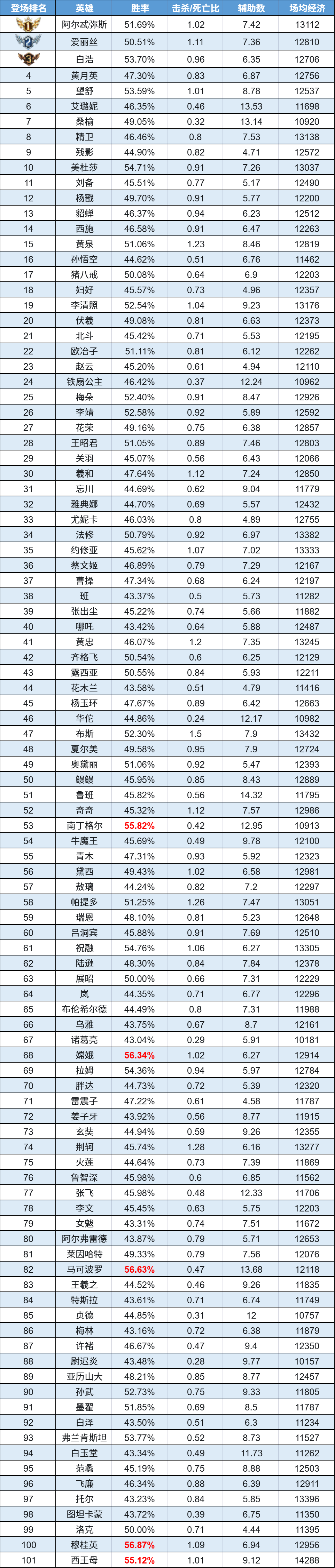 【低段位】艾璐妮热度略微上涨。穆桂英胜率强势登顶,马可波罗、嫦娥紧追其后。西王母蝉联场均经济TOP1。
