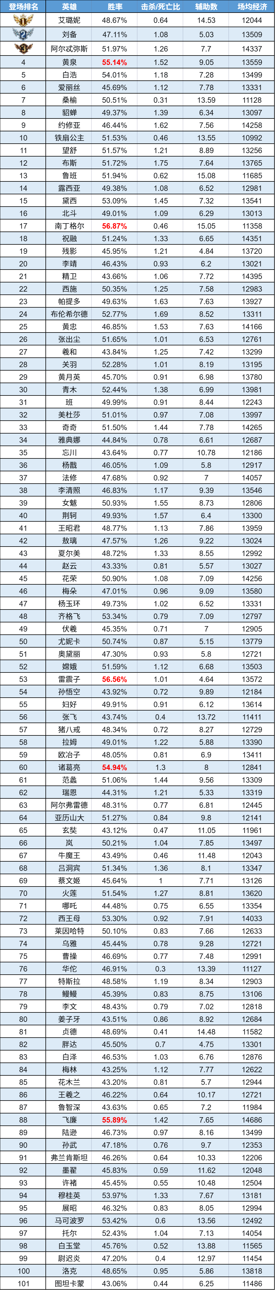【高段位】艾璐妮、刘备和阿尔忒弥斯继续霸占登场率前三。雷震子胜率重回TOP2。飞廉再度晋升场均经济榜首。