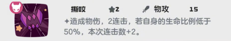 撕咬为双段物理攻击,常规状态下造成2次伤害;当自身当前生命值比例低于50%时,自动转化为4段连击。该机制高度依赖生存能力支撑,因此前期高生命个体值培养并非冗余,而是确保爆发阈值稳定触发的关键设计。