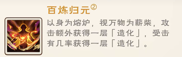 次式【百炼归元】属被动增益型技能,不消耗行动,亦无直接伤害。其效果为:每次主动攻击命中时,额外获得1层造化;同时,在受到敌方攻击时,有一定几率再获1层造化。此设计显著提升造化累积效率,使玩家在攻防转换中持续维持高层数储备,为后续爆发奠定基础。