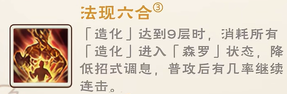 第三式【法现六合】需造化达满层(9层)方可激活。发动后清空全部造化,进入「森罗」状态。该状态下,所有招式调息时间缩短,且普攻命中后存在概率触发额外一次普攻,形成连击链。整体输出频率与节奏感明显增强,适用于快速压低单体或小队目标血线。