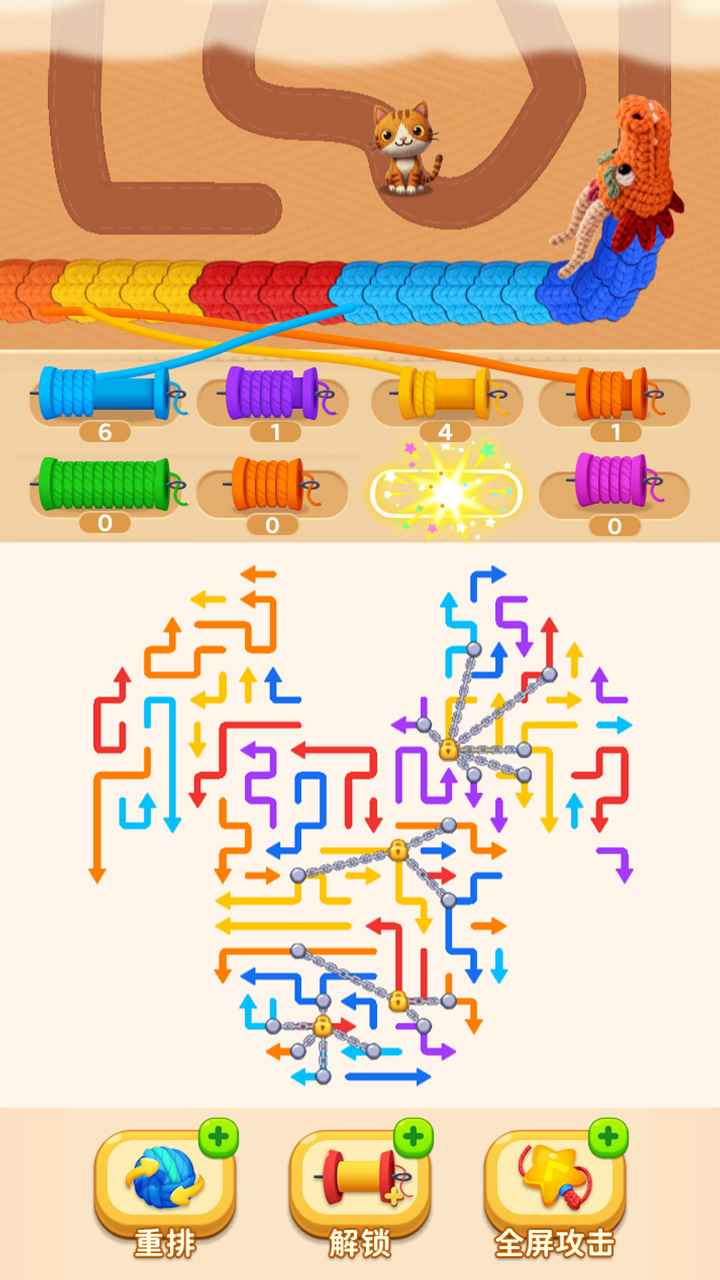游戏采用双线并行机制:一边整理箭头生成弹药,一边实时应对逼近的巨龙。巨龙自屏幕底部匀速向左推进,目标直指受保护的小猫。玩家需在限定时间内完成箭头调度,并将已生成的弹药精准投射至巨龙关节部位。值得注意的是,巨龙身体各关节具有固定颜色标识,仅对应色系的弹药方可造成有效伤害。屏幕顶部设有4个初始可用的线轴位,用于承接从巨龙身上掉落的不同颜色线团;当空间不足时,可通过观看激励视频解锁额外线轴位置,从而提升容错率与通关稳定性。