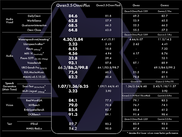 在检测嘈杂环境抗干扰能力的WenetSpeech测试中,Qwen3.5-Omni错误率远低于Gemini,识别准确率极高。