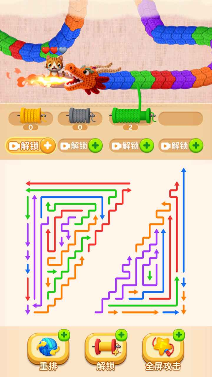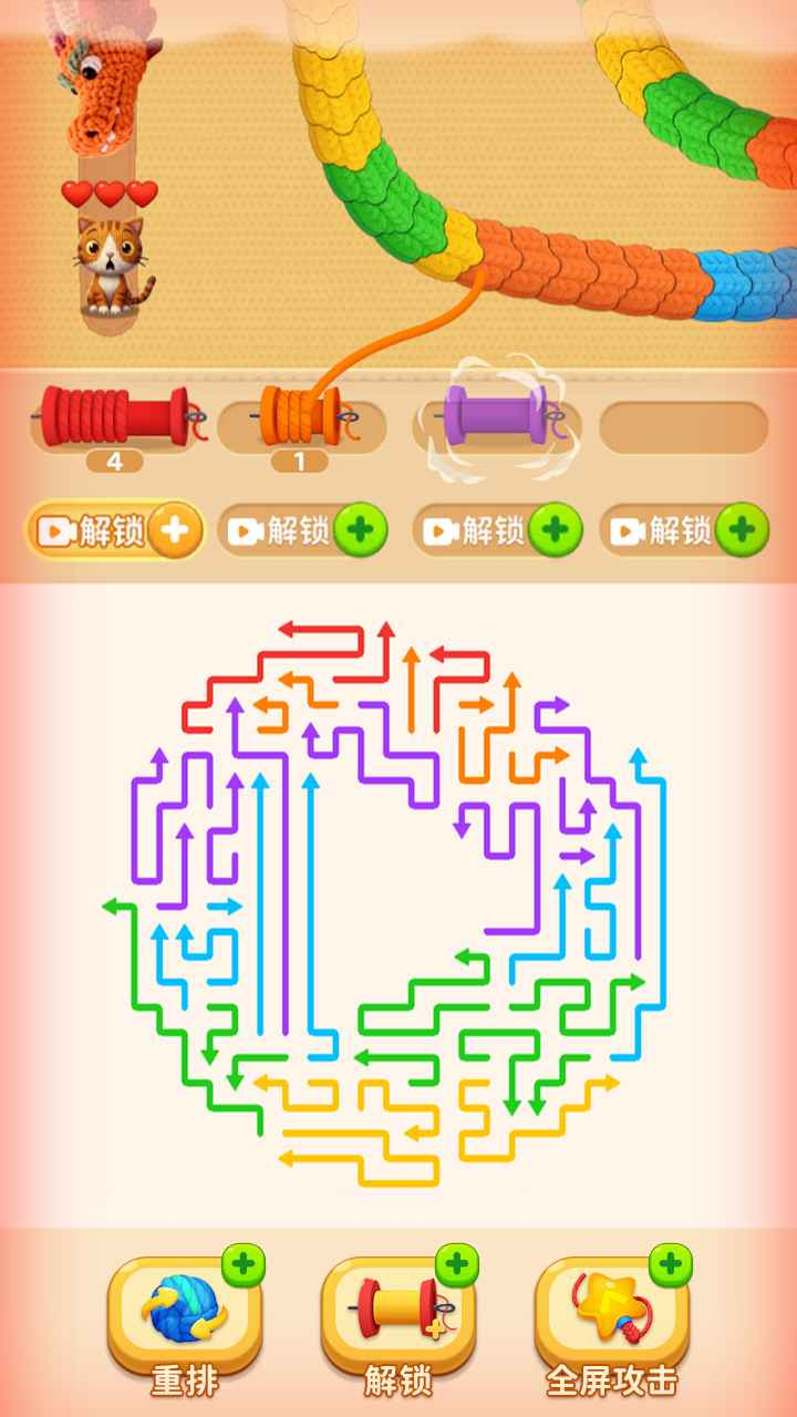 关卡设计以多维立体谜题为核心,每关均配置结构复杂、方向交错的箭头阵列。部分箭头被锁定状态,需优先解除限制;其余则需在倒计时内完成全局路径串联。当所有箭头成功连通后,将自动生成一条具象化的能量蛇——即该关卡最终Boss。击败它必须使用与能量蛇颜色严格匹配的实体弹药,强调色彩识别与战术预判能力。