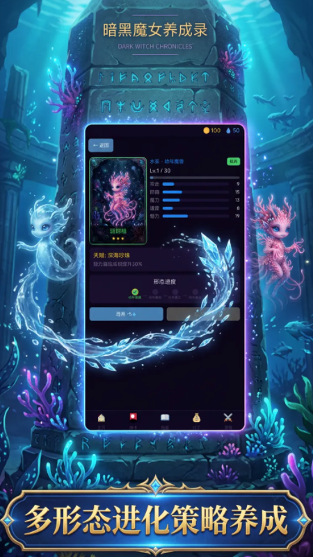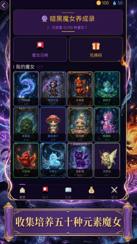 游戏世界设定于魔法能量失衡的危机纪元。大陆各处涌现大量敌对魔物,威胁城镇安危与生态平衡。玩家需通过契约仪式召唤初始魔女,并逐步解锁全部50+角色图鉴。早期获得的魔女多为基础形态,部分初始即呈现幼生魔兽态;随着培养深入,她们将经历多阶段进化——从弱小精魄成长为具备完整人格与强大力量的成熟魔女。每类魔女对应十余种元素类型组合,不同属性间存在克制关系,实战中需依据关卡机制与敌人弱点动态调整出战阵容。