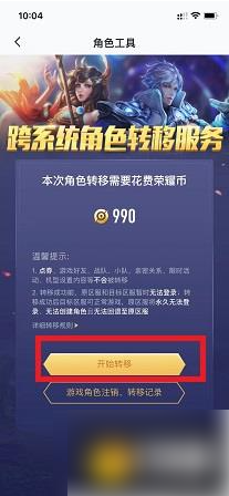 5.之后会弹出角色转移系统界面,点击开始转移选项进行转移,还有转移后的一些提示,可以进行查看;