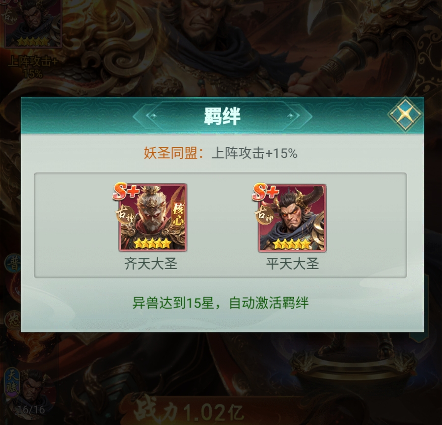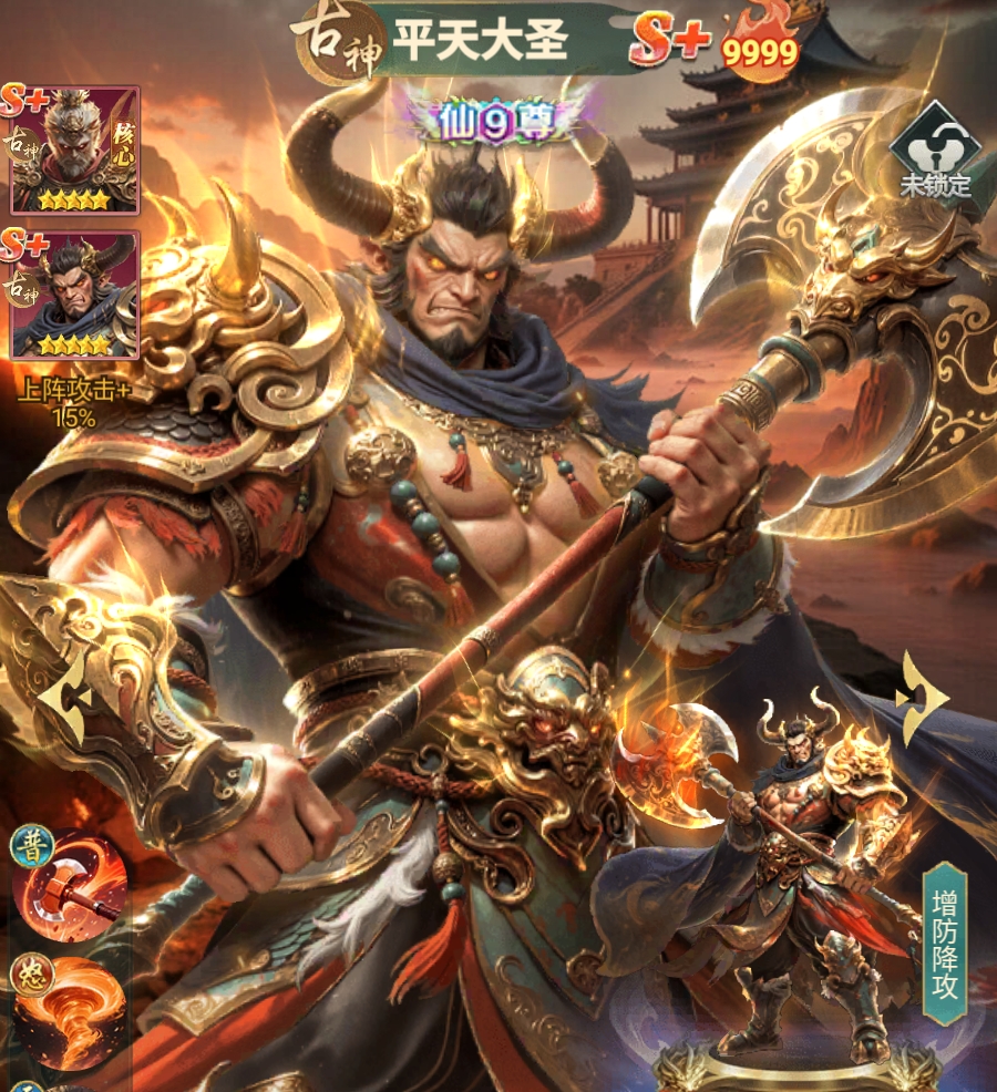 在阵容构建层面,平天大圣与齐天大圣存在固定羁绊,共同上阵时双方均可获得15%攻击力提升。由于齐天大圣本身具备古神阵营亲和性,因此二者天然构成古神体系核心双核。此时,平天大圣承担减攻+护甲双重职能,形成攻防闭环。即便玩家尚未集齐完整古神卡组,亦可将二人编入混搭队伍——其机制不依赖阵营数量,仅需羁绊生效即可稳定输出辅助价值。