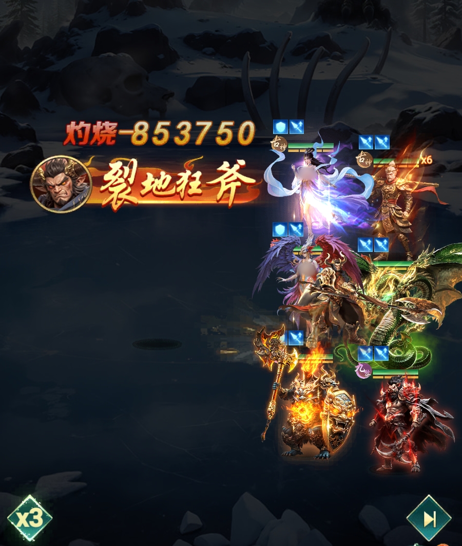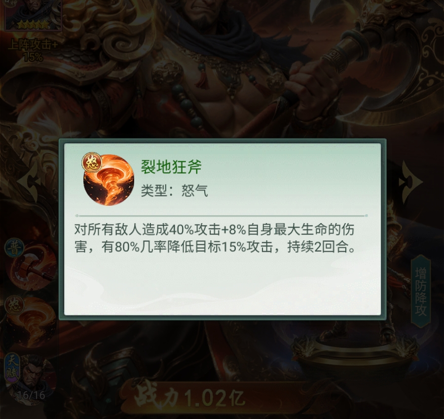 其核心输出兼控制技能“裂地狂斧”为怒气技,伤害基于自身最大生命值,对敌方全体生效。该技能附带攻击降低效果,单次命中触发概率达80%,在五人或六人战斗场景下,稳定影响3至4名目标。这一高覆盖率使其成为当前版本少有的群体减攻手段。为最大化战术收益,推荐将其配置于首发位置——优先施放可有效压制敌方首轮爆发,为己方输出与治疗争取关键节奏窗口。