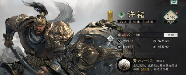组队打法大家可以这样去安排,许褚自带的天赋“背水一决”,能够盯住对面战力最强的角色,还能够给这个目标挂上“血战”的特殊状态。逼着对方和自己单独交手,他觉醒之后的技能,可以让自身的伤害再往上提升三成,对挂了状态的对手打出大量的伤害,战斗的时候靠队友给他加成的各种效果。许褚在1对1的过程里很快能够拿到上风,只要稳住单挑的节奏,就能先把对面最关键的角色打掉。这样一来,对面的整体战斗力就会大幅度下降,后续也能更容易掌握主动权。