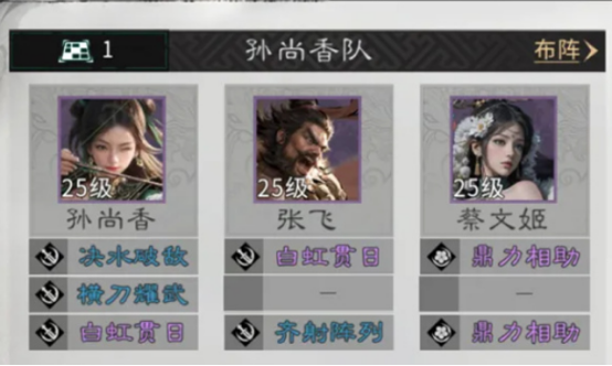 这三位武将都有各自的优势,如果巧妙搭配在一起,那简直就是首屈一指,可实现全方位的高度协同,包括续航力或者是压制力等等。不论在什么样的战役当中适应能力都特别卓越,但是在合理排兵布阵的时候,大家需要考虑清楚,比如其中的蔡文姬和张飞可以成功避开追击格,那么这样的合理搭配最大的优势就是整个行动的节奏相对来说特别稳定。而孙尚香却需要放置在这两种人物角色的追击格之内,就能够触发联动的效果。