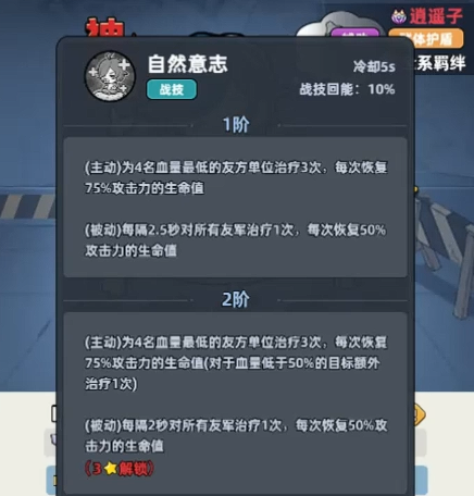 不仅可以给我方角色带来治疗效果,还可以带来更多的护盾能力,治疗效果当中,他用的战技叫做自然意志,通过这个技能可以给目前4名血量比较低的友方角色带来三次连续治疗,而且每一次都可以给这类队友带来75%左右攻击力上面的生命恢复,其中的被动效果同样也是可以在战技效果当中触发的,这里每隔2.5秒的时候,可以根据所有的队友来进行一次治疗,其中每一次的恢复数值,都达到50%的攻击上面提取出来的生命数值,而后期在生命数值上面,还可以通过阶级提升来得到更高的百分比,所以当前如果玩儿他的话,大家就要注意一般在面对敌人有群体输出的时候,他在这里带来的群体恢复会效果更好一些,而且在提升了我方暴击以及各种追击伤害提战力以后,他在增益手段上面可以用的地方有比较多的选择性。
